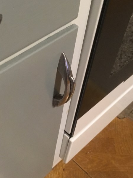 Den nya grå kulören matchar de gamla och rätt ovanliga skåphandtagen.