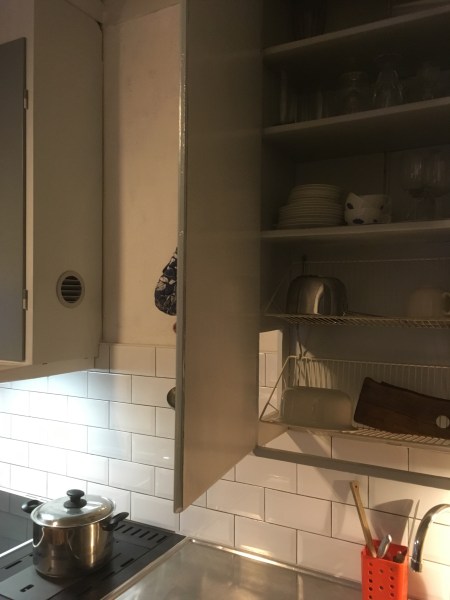 De gamla inbyggda diskställen är kvar och skåpen nymålade inuti och utanpå. Väggen nykaklad bakom och ett runt utblås för kolfilterfläkt i skåpets sida.